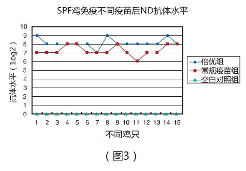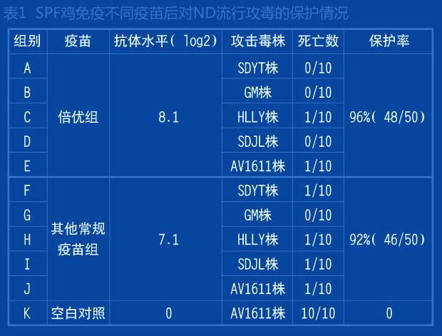 在實驗室條件下,SPF雞7日齡一次免疫倍優(yōu)系列產(chǎn)品(ND+H9 ) 0.1ml ,免疫后21天采用各地分離的流行ND毒株(基因VII型)進行攻毒, 倍優(yōu)組的攻毒保護為96%(表1)。