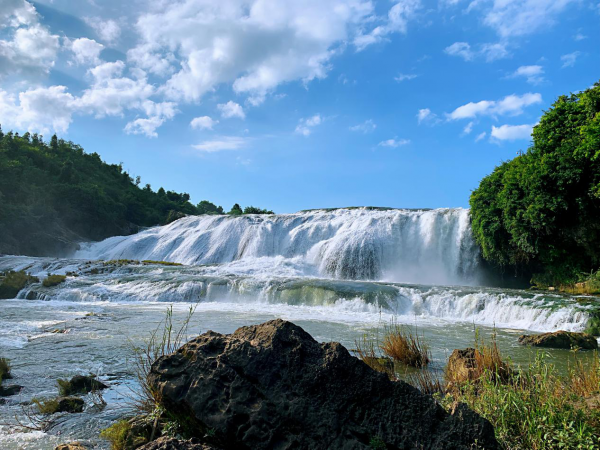 “遙聞水聲轟轟,從隴隙北望,忽有水自東北山腋瀉崖而下,搗入重淵,但見其上橫白闊數丈”陡坡塘瀑布是黃果樹瀑布群中瀑頂最寬的瀑布,瀑頂寬105米,高21米,遠遠望去,水流奔騰咆哮,水聲轟隆,極為壯觀。