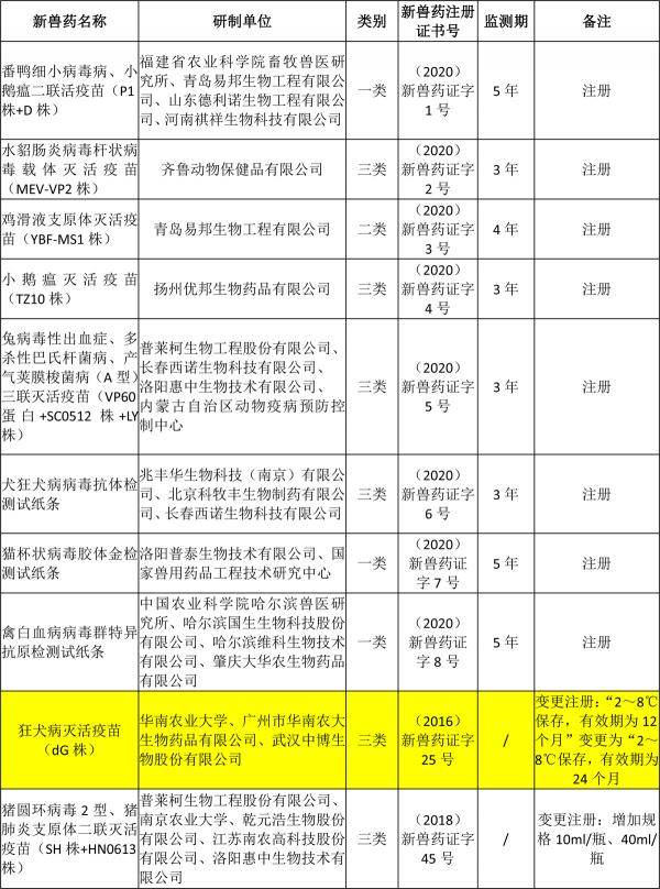 批準華南農業大學等8家單位申報的狂犬病滅活疫苗(dG株)等2種獸藥產品變更注冊,自發布之日起執行。